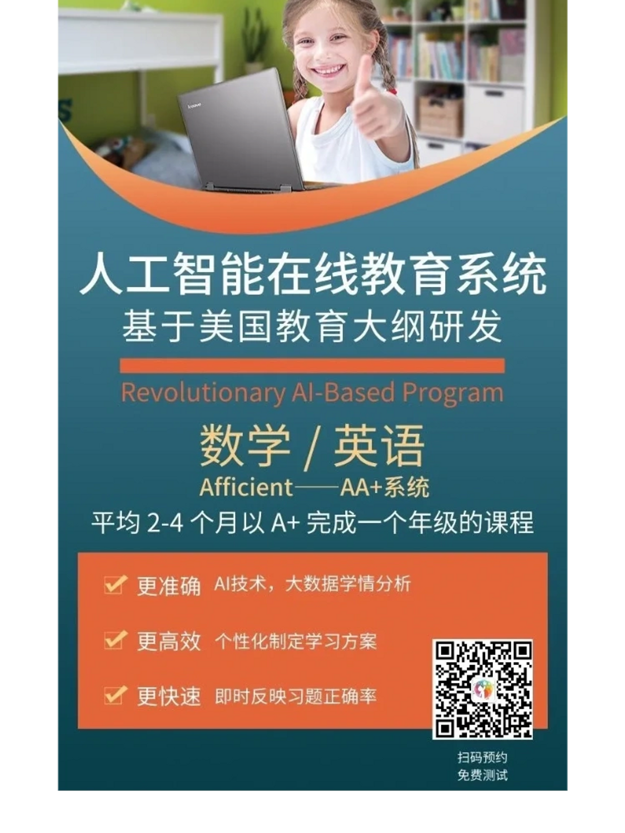 Afficient 含英语和数学两个学习系统。按照美国大纲,学习效率提高3倍。提供美国真人老师实时在线答疑辅导(随时无需预约),更有每周固定时间(50分钟)真人老师监督下的辅助学习项目(需要预约)。